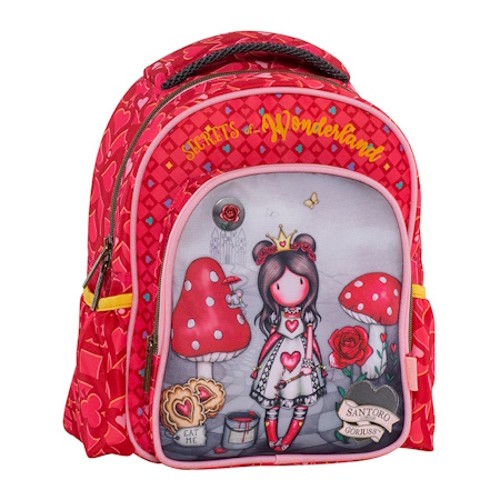 Σχολική τσάντα η οποία μπορεί να φορεθεί στην πλάτη, κατάλληλη για παιδιά δημοτικού της εταιρίας Graffiti με θέμα Gorjuss σε κόκκινο χρώμα.