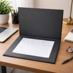 Σουμέν γραφείου πολυτελείας διπλό. Ανοίγει και τοποθετείτε ανάμεσα τα χαρτιά σας. Από οικολογικό δέρμα (PU), πυρογραφικό. Δυνατότητα εκτύπωσης μς πυρογραφία ή ασημοτυπία. Χρώμα: μαύρο. Διαστάσεις: ανοιχτό 44×64εκ. και κλειστό 44×32εκ.